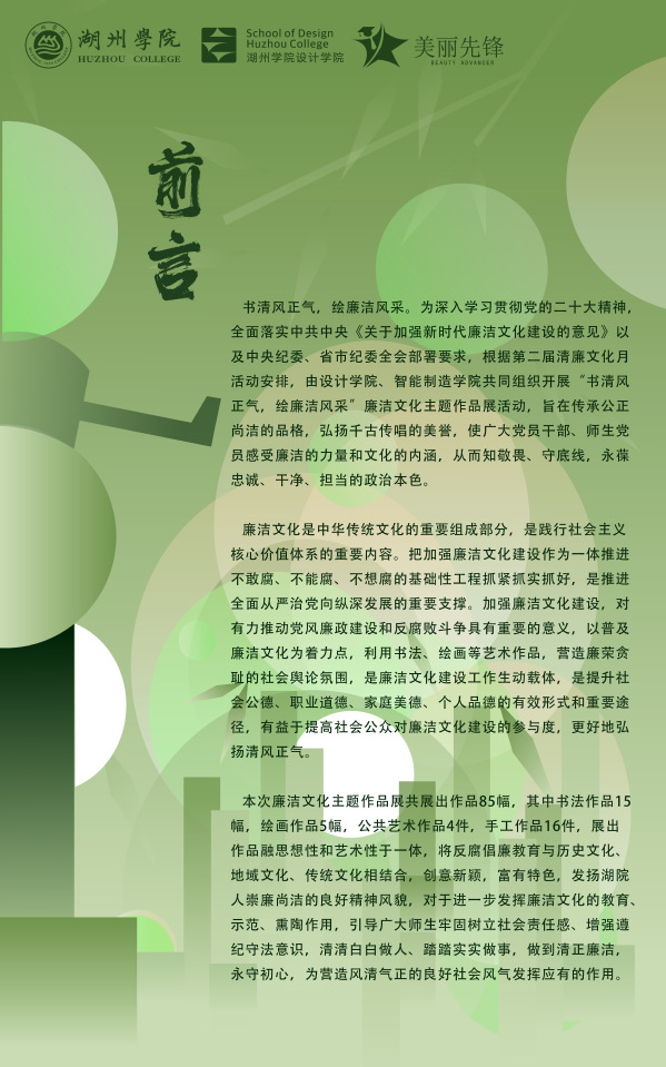 根据学校第二届清廉文化月活动安排,由设计学院、智能制造学院共同组织开展“书清风正气,绘廉洁风采”廉洁文化主题作品展活动,展期如下: