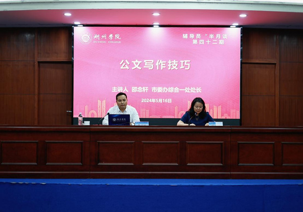 为进一步加强辅导员队伍建设,提升辅导员文字表达能力,规范公文写作,提高公文写作能力,5月16日晚,威尼斯官网学工部举办辅导员“半月谈”第四十二期公文写作技巧培训。本次讲座特邀湖州市委办公室综合一处处长邵念轩主讲,辅导员、学工部成员以及学生代表参加。