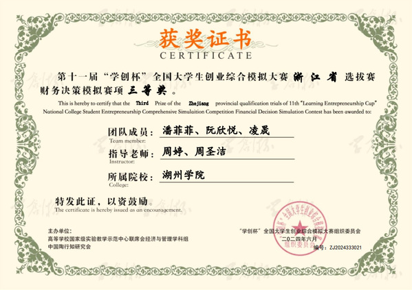 近期,第十一届“学创杯”全国大学生创业综合模拟大赛浙江省选拔赛圆满落幕。由经济管理学院(绿色金融学院)教师周婷和周圣洁指导的“凑一队”(团队成员:潘菲菲、阮欣悦、凌晟)获得了本科组三等奖的优异成绩。同时两位老师也分别被组委会授予优秀指导老师的荣誉。